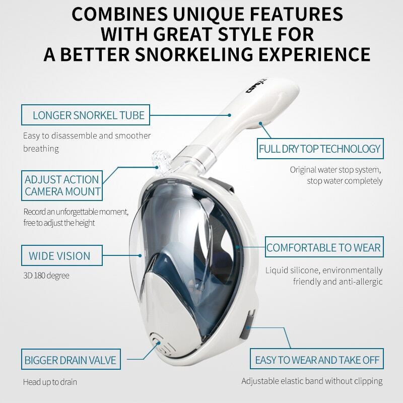 COPOZZ full face snorkel mask combines unique features with great style for a better snorkelling experience. Let you get more out of their underwater adventures.